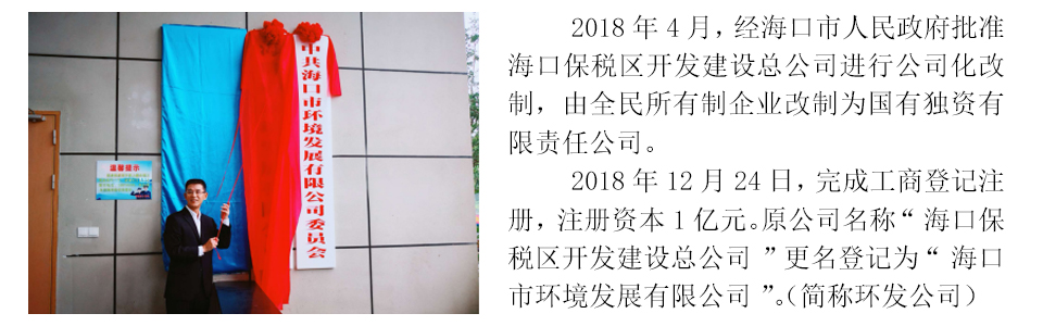 海口市環境發展有限公司是??谑袑賴歇氋Y有限責任公司,于2018年12月正式掛牌運營,注冊資本1億元,由1993年12月成立的??诒6悈^開發建設總公司進行公司化改制而成,核心業務為環境環衛產業投資和運營、資產運營和管理,培育業務為工程管理